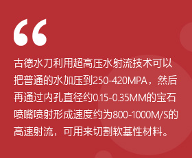 古德 ( 廣東 ) 自動化科技有限公司長期專注研發(fā)水射流技術(shù),是一家專業(yè)從事水刀設(shè)計、生產(chǎn)、銷售、服務(wù)為一體的水刀生產(chǎn)制造商。公司位于佛山市順德區(qū)大良,是國內(nèi)規(guī)模較大的水刀生產(chǎn)廠家之一。